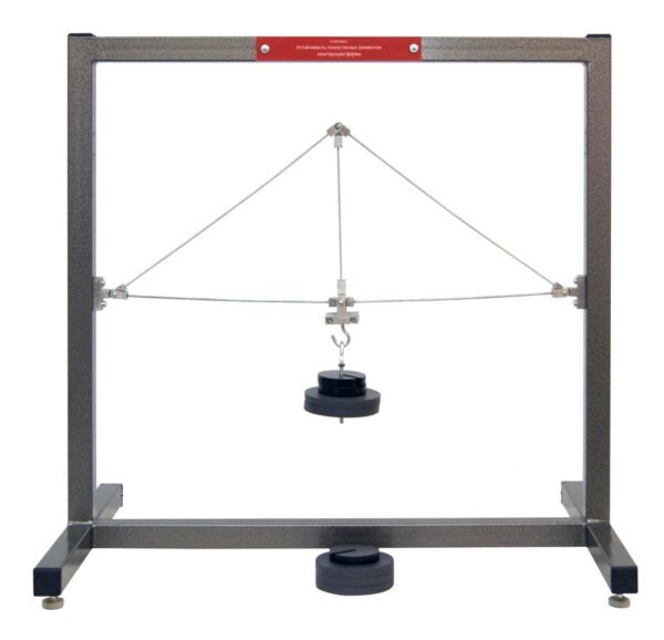 Стенд представляет собой сварное основание, установление на регулируемых отводах, которые предназначены для горизонтальной установки комплекса на рабочий стол. На основании установлен участок фермы, который выполнен из стальных шпилек диаметром 3 мм. Снизу имеется точка подвеса для установки грузов. Шпильки могут быть легко заменены на новые (в комплект поставки входит несколько запасных шпилек).